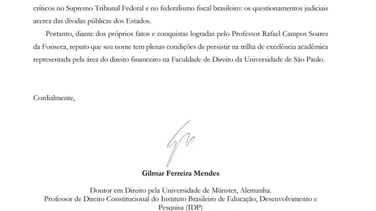 Candidado a professor na Faculdade de Direito da USP apresentou cartas de recomendação de ministros do STF.